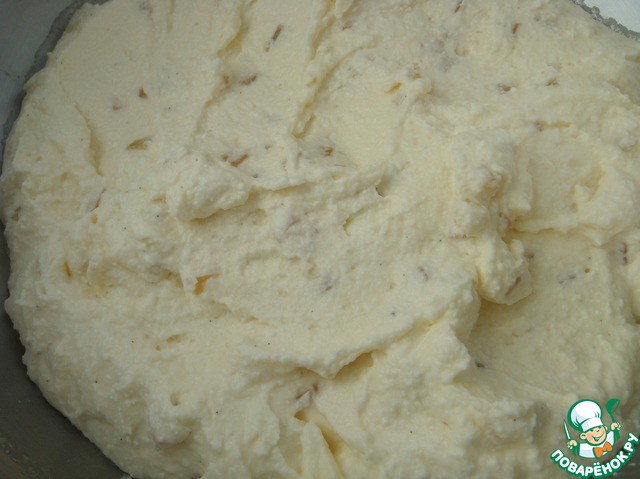 Вынуть семена ванили, разрезав стручок ванили вдоль, и перемешать их с творогом.