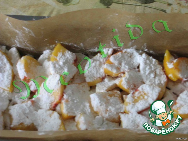 Нектарин ошпарить кипятком, снять шкурку и нарезать кусочками, выложить на груши