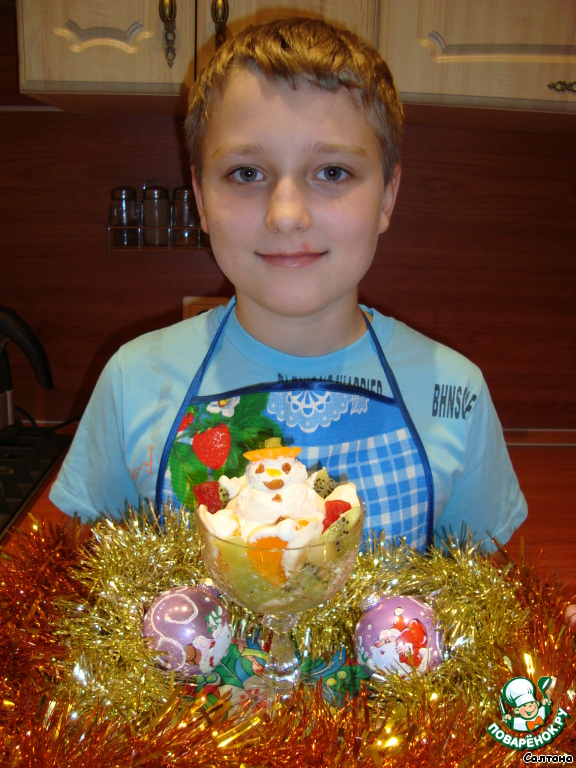 На дно вазочки уложить кусочки бананов и мелкие кусочки киви. Из творожка сформовать несколько разных по размеру шариков и выложить их поверх фруктов в виде снеговика