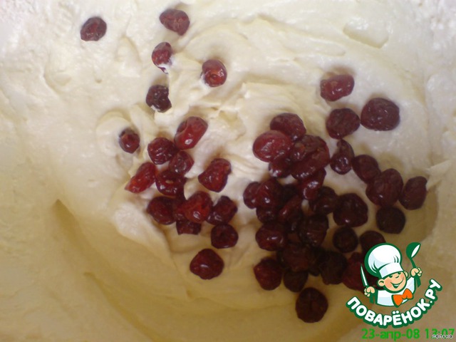 Взбить творог + сливочное масло + сметану + сахар до получения кремообразной массы, добавить вишню, перемешать