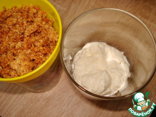 В стакан слоями выкладывать, сначала творожный слой, потом слой крошки.
