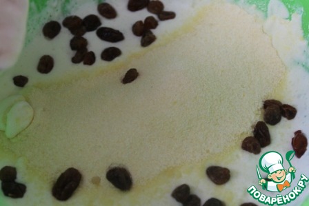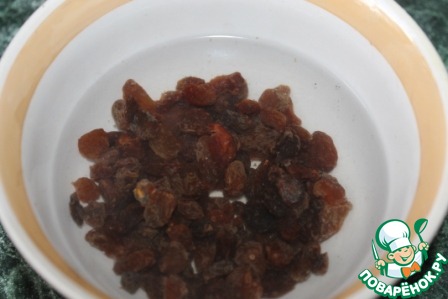 Промываем изюм, заливаем кипятком и замачиваем 10 минут.