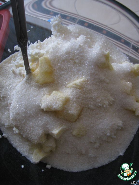 Протираем творог через сито, добавляем сахар, яйцо, масло кусочками, манку. Все хорошо перемешиваем.