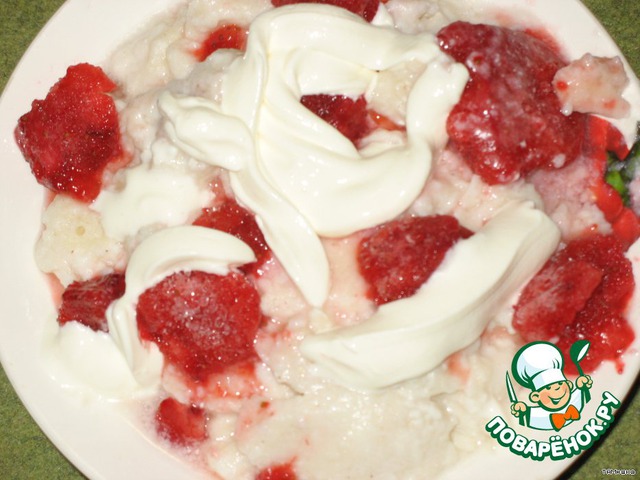 Украшаем клубничкой, перетертой с сахаром (у меня была замороженная масса, думаю, можно измеличить в блендере целые ягоды) - клубничка придает свежесть - и поливаем сметанкой.