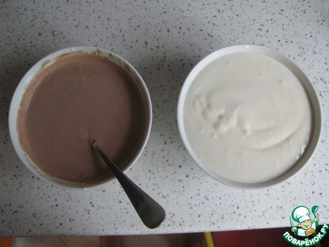Накладываем в формочки (как пирог зебра), сначала ложку массы без какао, затем ложку с какао. Ставим в холодильник, пока не застынет.