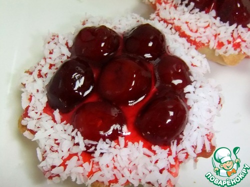 Залить вишню желе и поставить в холод до полного застывания. По краям для красоты можно посыпать кокосовой стружкой.
