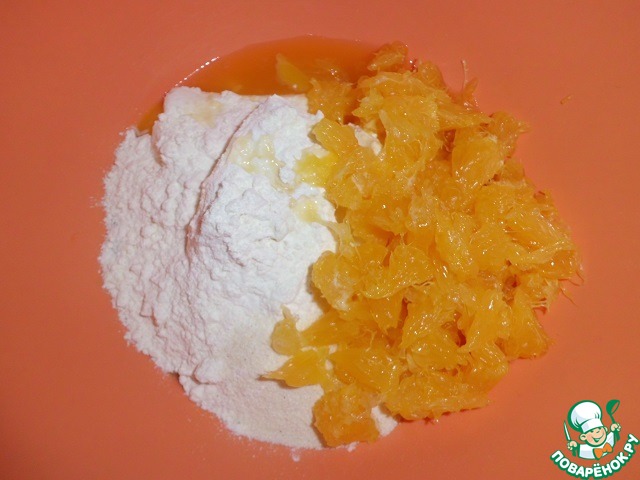 Апельсин очистить, удалить белую кожицу и внутренние пленки, мякоть нарезать, выделившийся сок собрать. Мне проще разрезать апельсин вдоль и каждую половинку поперек и тогда апельсин легко разделать на "ячейки" и извлечь мякоть.