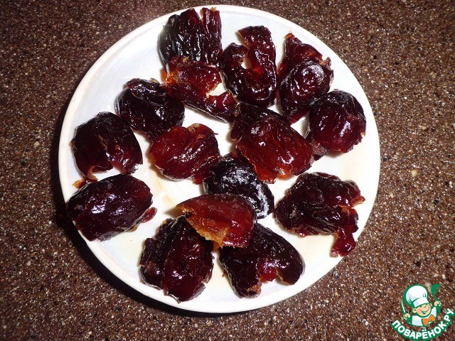 Финики нужно аккуратно разделить пополам и извлечь косточку, после этого осторожно снять кожицу. У меня финики оказались уже без косточек и слегка "подсушенные", поэтому снимать кожицу я не стала (облегчила себе труд)))