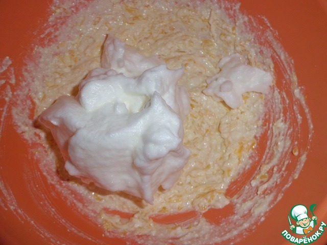 Белки взбиваем в отдельной посуде, до устойчивых пик. Добавляем к нашей массе и аккуратно вмешиваем..