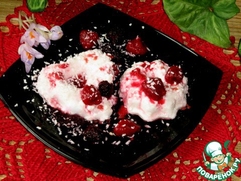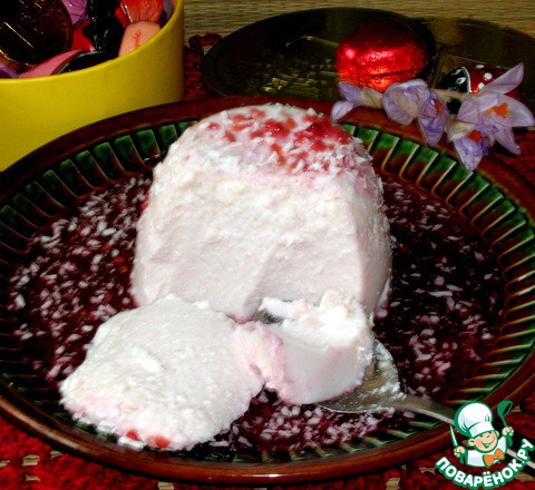 Десерт полила сверху малиновым сиропом и посыпала кокосовой стружкой.