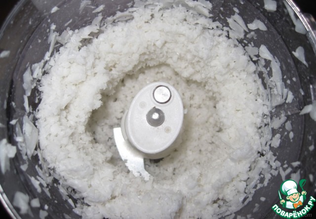 Мякоть одного кокоса измельчить блендером. И добавить её в творожную массу, перемешать.