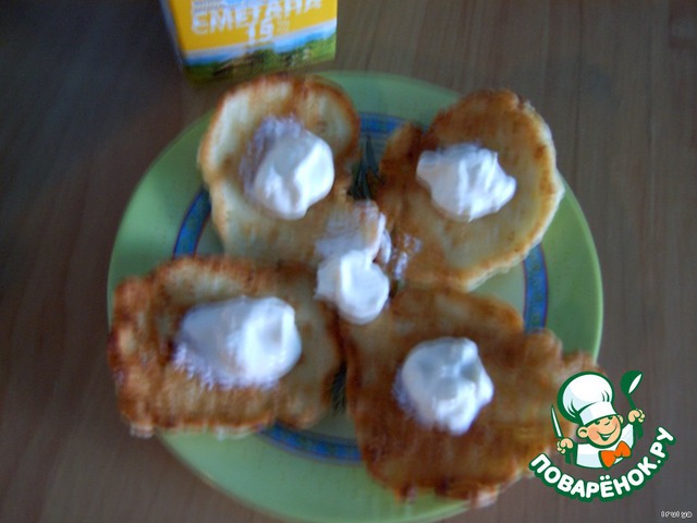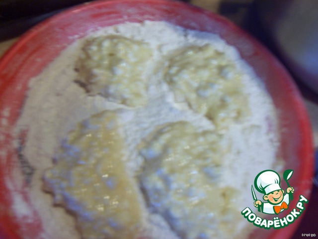 Смешать творог, яйца и сахар. Добавить соль, соду и муку. Тесто должно получится как на оладьи.