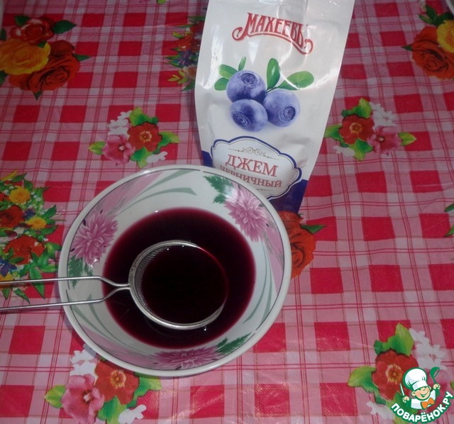 Тем временем развести джем в 0,5 стак. воды. Процедить от косточек и ягод. Ягоды отобрать и промыть в воде из под крана. Ягодки пригодятся для украшения.