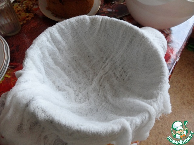Подготавливаем форму для настаивания пасхи. Я помещаю старый дуршлаг в подходящую по размеру кастрюлю, выстилаем дуршлаг увлажненной марлей в 2-3 сложения.