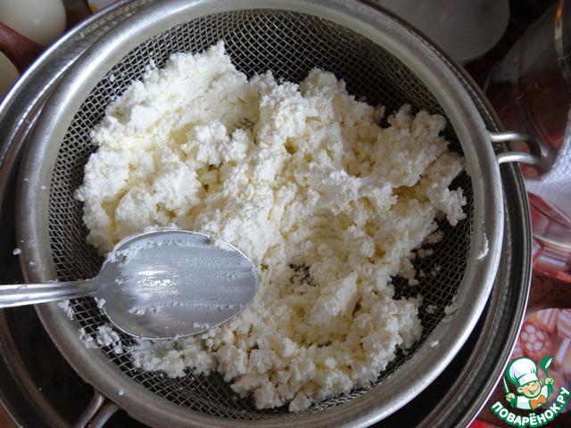 Приступаем к готовке, обязательно в хорошем настроении! Можно и молитву прочитать, но главное - позитивный настрой, тогда всё получится легко и быстро! Творог желательно заранее вынуть из холодильника, пусть постоит при комнатной температуре часок, легче будет протирать. Приготовьте сито и удобную посуду, у меня кастрюля. Ещё раз повторюсь, чем жирней творог, тем лучше результат!