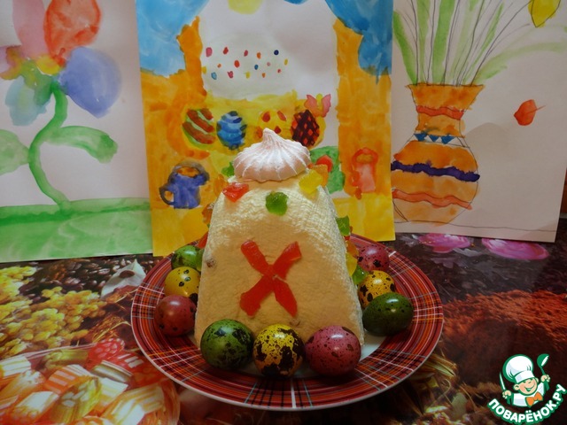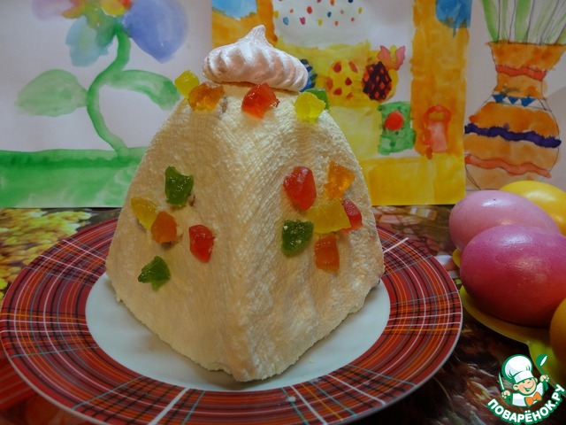 В дуршлаг всё не влезло, остаток выложила в маленькую пластмассовую пасочницу, но мне в ней не очень нравится делать, ровная и красивая пирамидка никогда не получается. Вот у моей бабушки специальная большая деревянная пасочница, в ней всё замечательно выходит. Но приходится пользоваться тем, что есть.