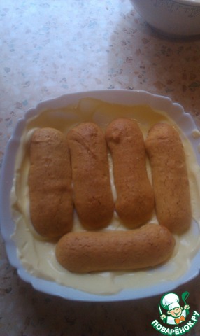 На дно формы вылаживаем тонкий слой крема в 1мм. Печенье Савоярди опускаем в кофе на 2 сек, не более (если подержать дольше десерт будет водянистым).