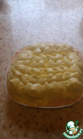 На печенье выкладываем крем - щедро обмазываем, опять печенье... и т. д. всего выкладывается 3 слоя печенья. Тирамису - это десерт состоящий из 3 слоев печенья и крема, если віложить больше слоев десерт "просядет". Верхний слой формируем так: в кондитерский мешок (или просто полиэтиленовый пакет) накладываем крем, срезаем край шириной 0,5 см и формируем капельки по всей поверхности десерта