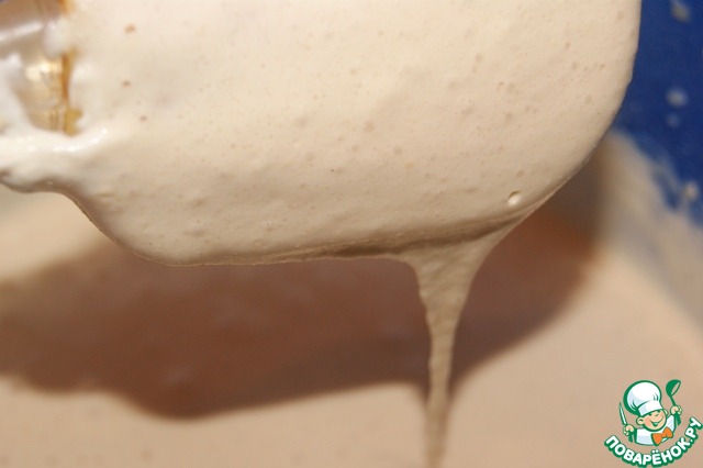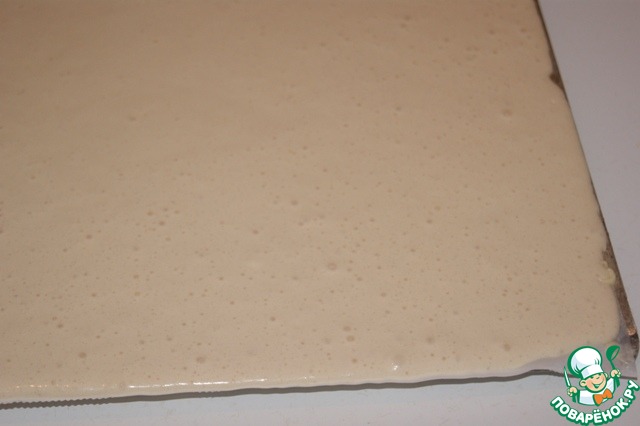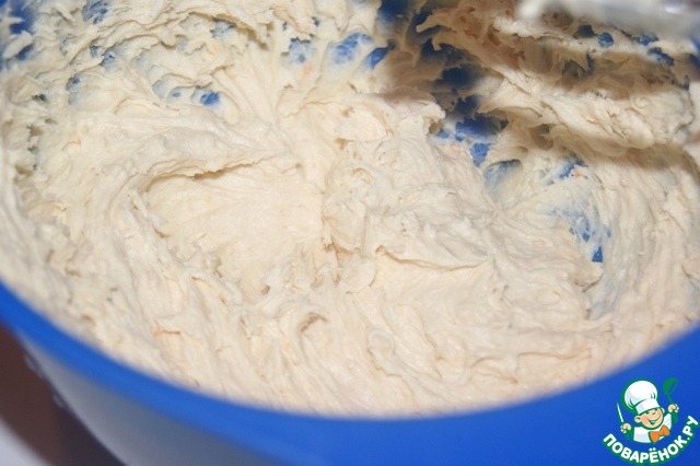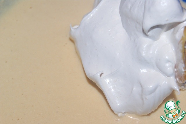 В отдельной емкости взбить в пену 4 желтка, добавить масло 50 г и молоко, опять взбить. Добавить муку 100 г, 1 г ванили и взбить венчиком. Вввести в три приема взбитые белки, перемешивая лопаточкой снизу вверх и по кругу