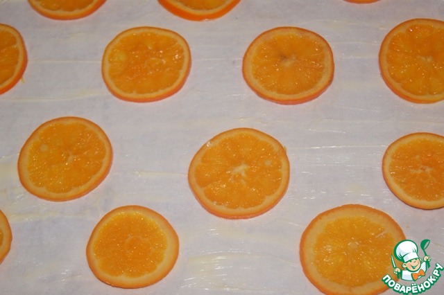 Противень 24Х35 см застелить пекарской бумагой и смазать сливочным маслом. Выстелить на нее остывшие апельсины. Лучше это сделать до приготовления теста.