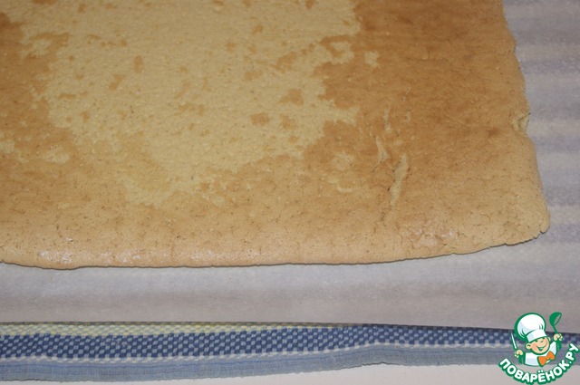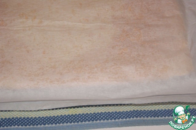 Поместить бисквит вместе с бумагой на полотенце, накрыть чистой бумагой сверху.