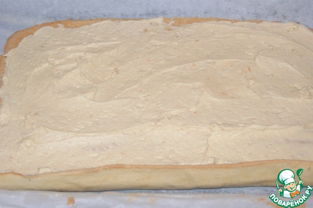 Аккуратно развернуть бисквит и нанести на него крем. Свернуть уже без бумаги и полотенца.