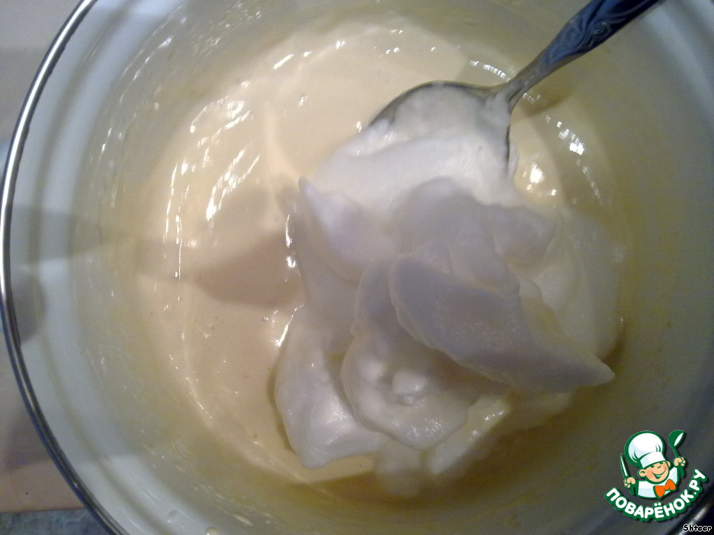 Из желтков, сахара муки и белков замесить бисквитное тесто.
