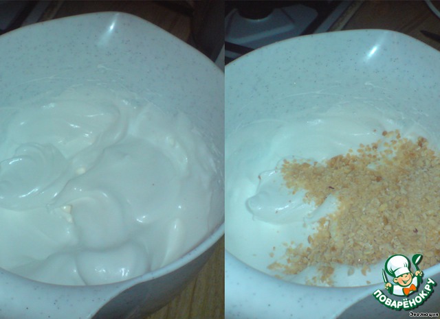 Всыпаем измельченный очищенный обжаренный арахис (а лучше фундук), крахмал и уксус. Круговыми движениями аккуратно размешиваем, стараемся не повредить воздушную структуру взбитых белков.