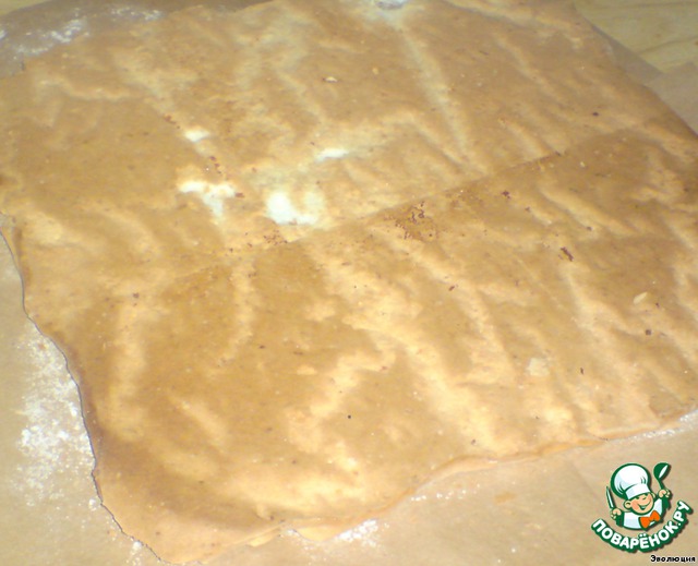 Переворачиваем его на чистый пергамент, даем остыть минут пять, осторожно снимаем бумагу, на которой он выпекался.
