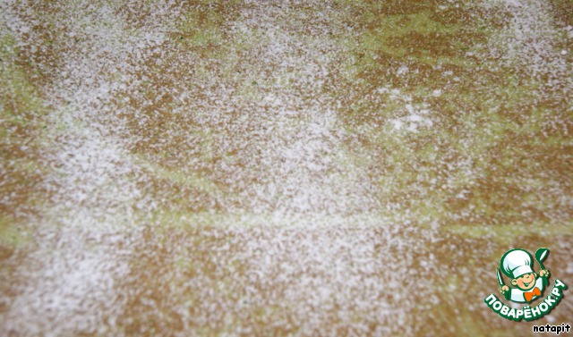 Готовый бисквит посыпать сверху сахарной пудрой и, перевернув на чистый лист пекарской бумаги, освободить от бумаги, на которой он выпекался.