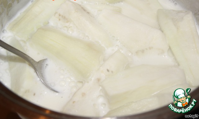В горячем молоке растворить сахар и ваниль, поместить в него баклажаны и варить 7-8 минут. Остудить.