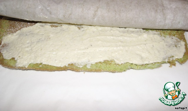 Осторожно и постепенно развёртывая и смазывая кремом бисквит, тут же сворачиваем его в рулет (тесто очень нежное и может лопаться),чтобы было более понятно - развернули кусочек бисквита, смазали и закрутили, т.е. не смазываем весь рулет сразу! Поместить рулет в холодильник на 3-4 часа.