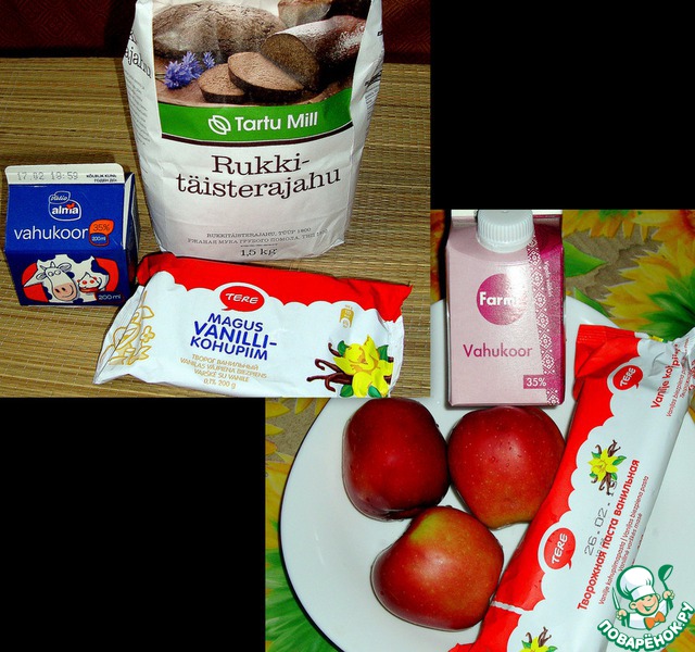 Ингредиенты для рулета. Мука ржаная. Сливки. Творог я беру каждый раз разный. В оригинале для начинки нужно использовать банан. Сегодня у меня рулет с добавлением яблок.