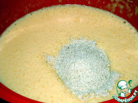 Яйца взбила миксером вместе с сахаром до пены. Туда добавила муку, крахмал и разрыхлитель. И снова взбила.