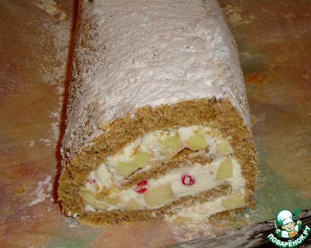 А этот с яблоками. Сверху рулет можно присыпать сахарной пудрой. С яблоками я чуть перестаралась. Рулет тяжеловат и не очень круглый получился.