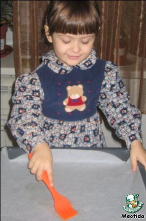 Противень застилаем бумагой для выпекания и смазываем ее маслом.