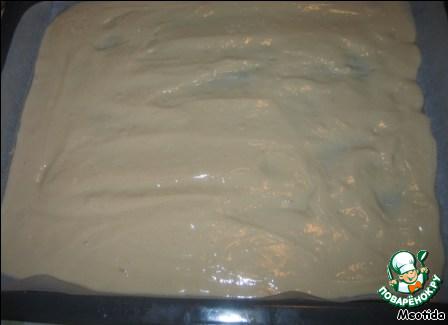 Выливаем на противень тесто, разравниваем и отправляем в разогретую до 215С духовку минут на 12-15, до золотистого цвета. Готовность можно проверить спичкой.