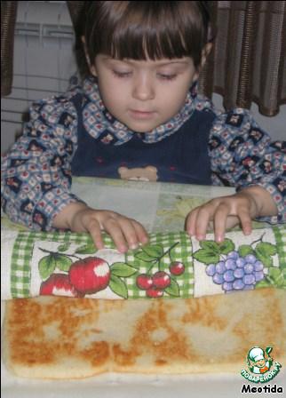 Готовый корж, сразу из духовки переворачиваем на кухонное полотенце, снимаем бумагу, на которой корж выпекался и сворачиваем в плотный рулет, оставляем минут на 5.
