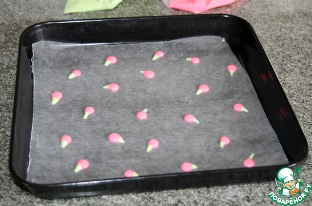 Для теста яйца взбить с сахаром в пышную белую массу, отделять желтки не надо. Таким образом рулет будет эластичен и не будет ломатся при скручивании. Этот секрет я не давно подсмотрела у поваренка ОльгаНиколь* за что ей огромная благодарность!). Добавляем просеянную муку и аккуратно перемешиваем. Тепер в две чашки положить по две ст. л. теста и добавить красители, в одну красный, в другую зеленый. Форму застелить пекарской бумагой и рисуем наши вишенки.