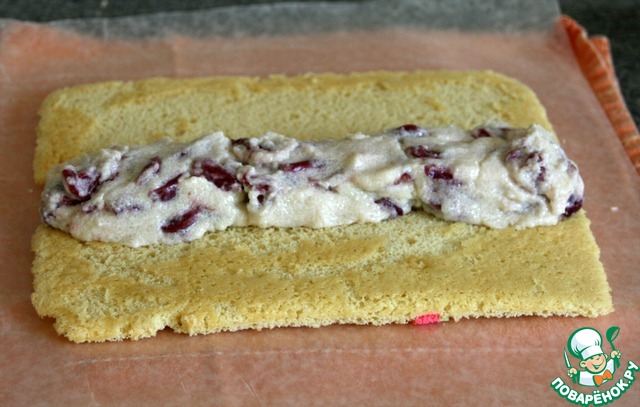 Масло хорошо взбиваем, добавляем манку и еще взбиваем до готовности крема. Добавляем вишню, перемешиваем и выкладываем крем колбаской на рулет.