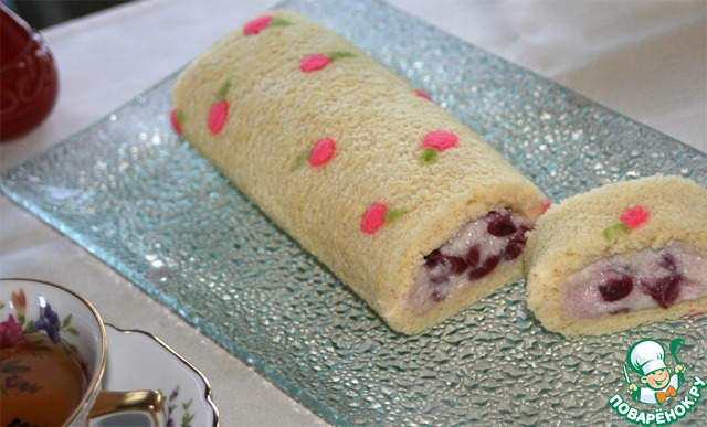 | Красивый, праздничный рулетик как весеннее настроение. Нежный бисквит и манный крем с вишней очень гармонично сочетаются. |