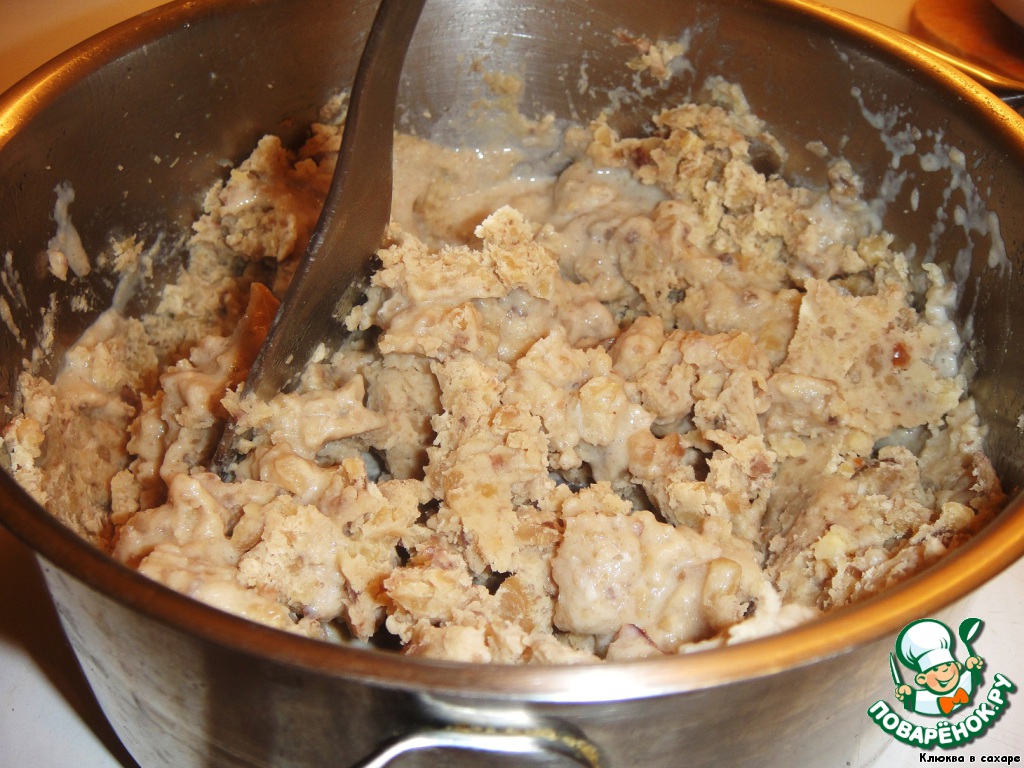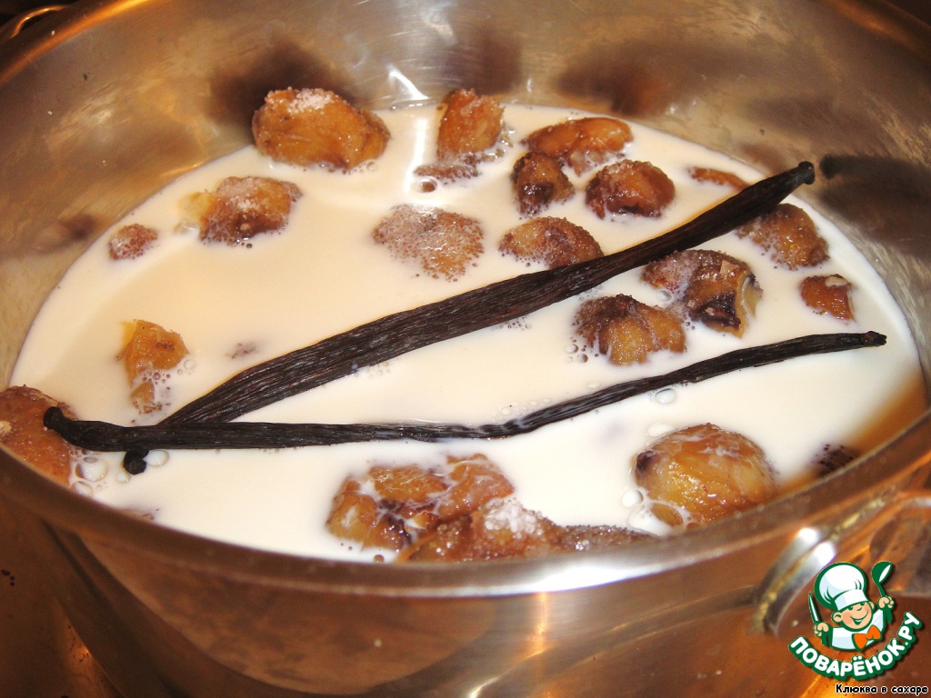 Сливаем в отдельную кружку излишки молока (не выливать), выбрасываем палочки ванили, а каштаны разминаем толкушкой в пюре, подливая по мере необходимости молоко из кружки. Масса должна быть густой, но не слишком сухой.
