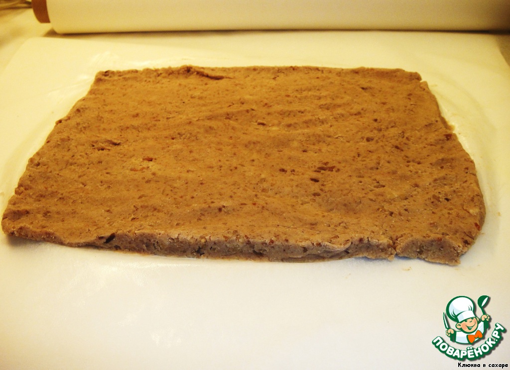 Кондитерскую (пекарскую) бумагу смазываем сливочным маслом и выкладываем на неё каштановую массу равномерным прямоугольным слоем толщиной около 1 см.