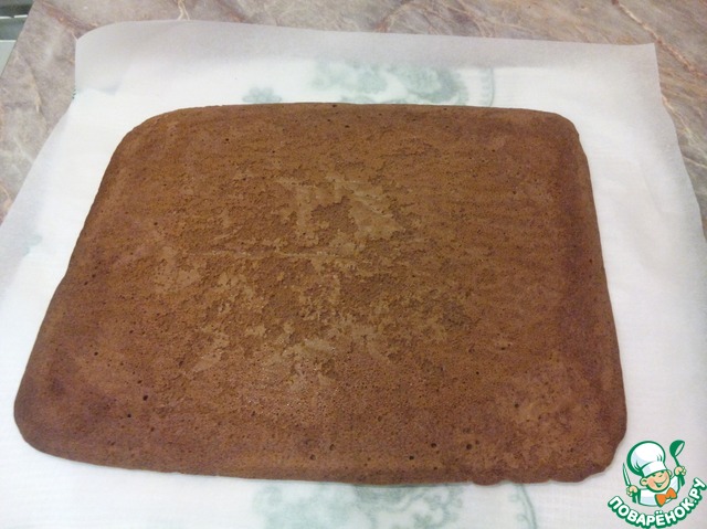 Взять кухонное полотенце, намочить водой, чтоб было влажным, и расстелить на столе, сверху бумагу для выпечки по размеру пласта теста. Готовый бисквит перевернуть на полотенце с расстеленной бумагой, убрать бумагу для выпечки, на которой выпекался, и аккуратно закрутить в рулет туго. Дать остыть до теплого.