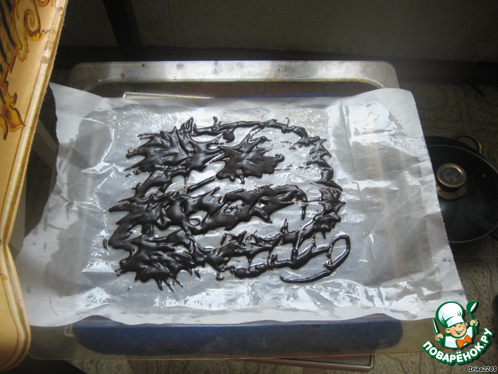 Нарисовать с помощью корнетика узоры (для шприца тесто жидкое), более изящные, чем у меня (можно даже нарисовать узоры карандашом на обратной стороне пергамента).