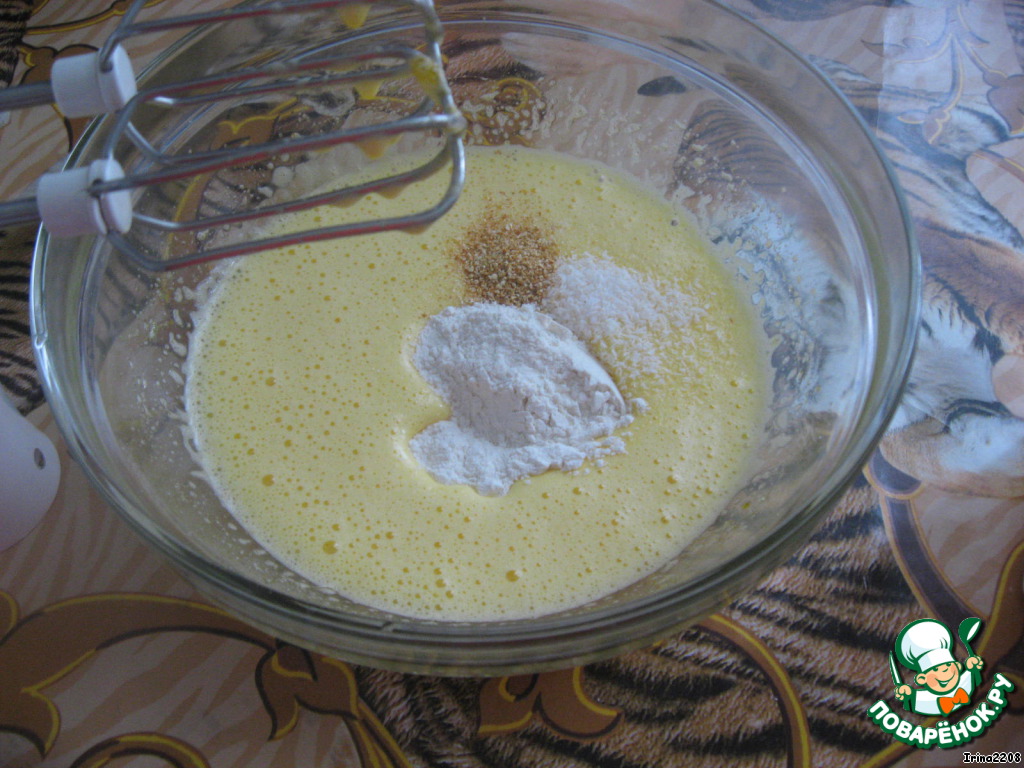 Для рулета взбить 2 яйца и 1 желток с 2,5 ст.л. сахара в хорошую пену, добавить по желанию цедру апельсина, кокосовую стружку,
