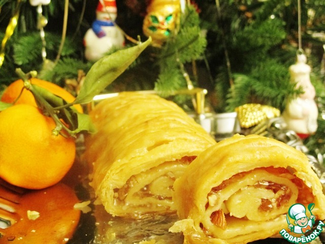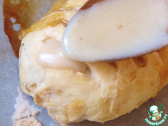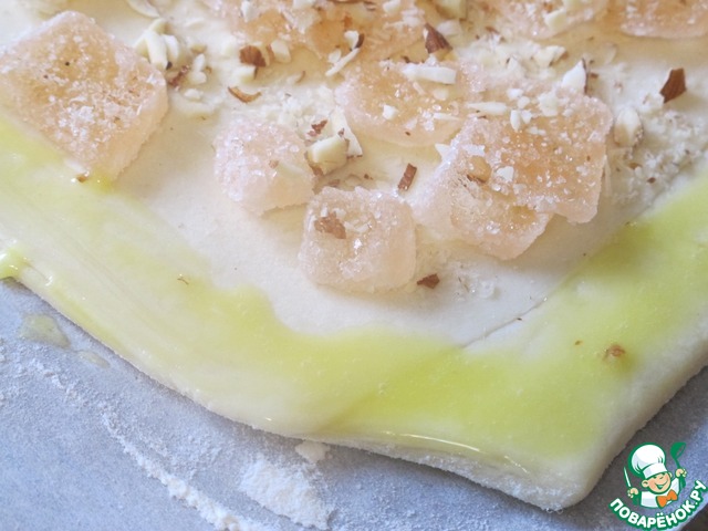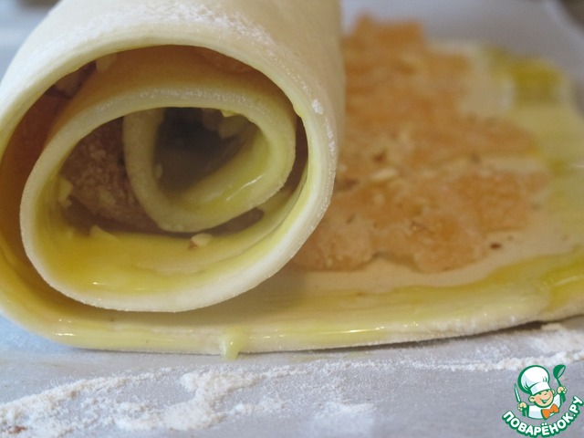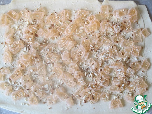 Слоеное тесто разморозить. Не разделяя листов, раскатать их в прямоугольник толщиной в 3 мм.