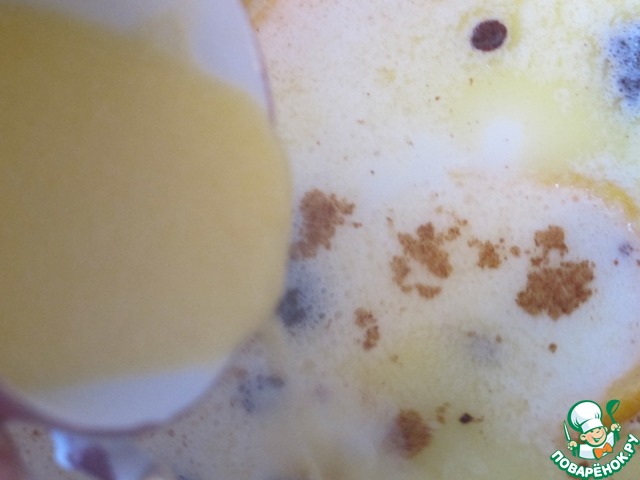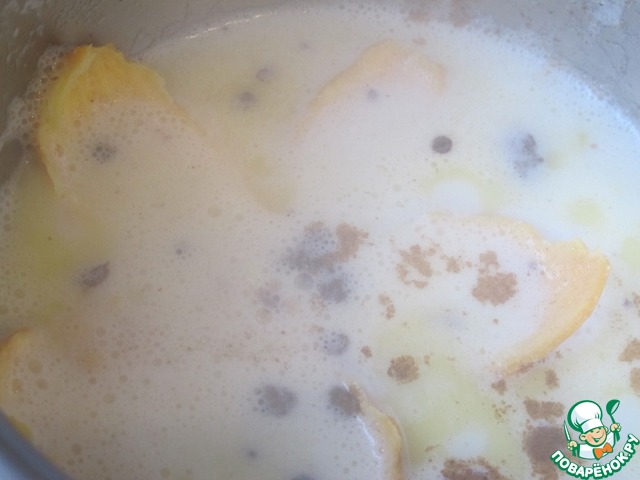 Нагреть молоко с сахаром, мандариновой коркой, сливочным маслом, корицей и хересом.