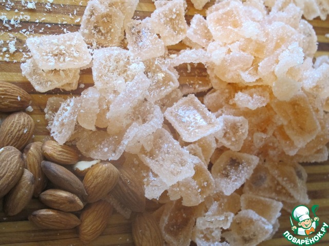 Мандариновый мармелад тонко нарезать, миндаль порубить. Все перемешать.