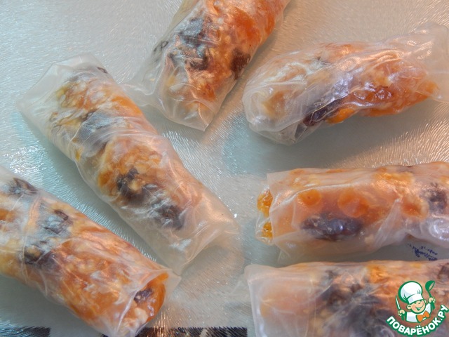 Рисовую бумагу на 15 секунд помещаем в воду (бумага разная, поэтому смотрите, что написано на упаковке), затем достаем, убираем излишки воды. На краешек выкладываем начинку и формируем рулетик.